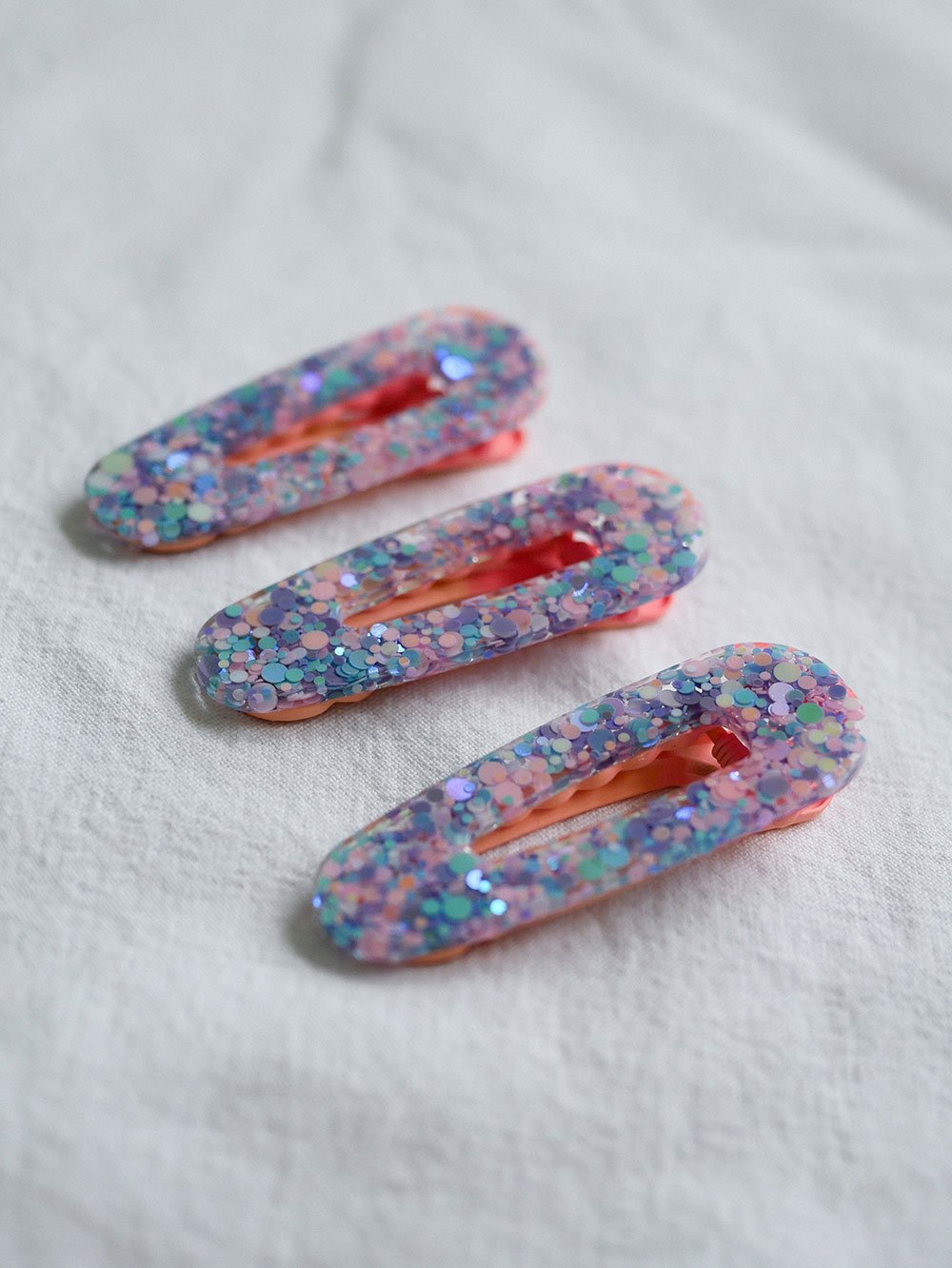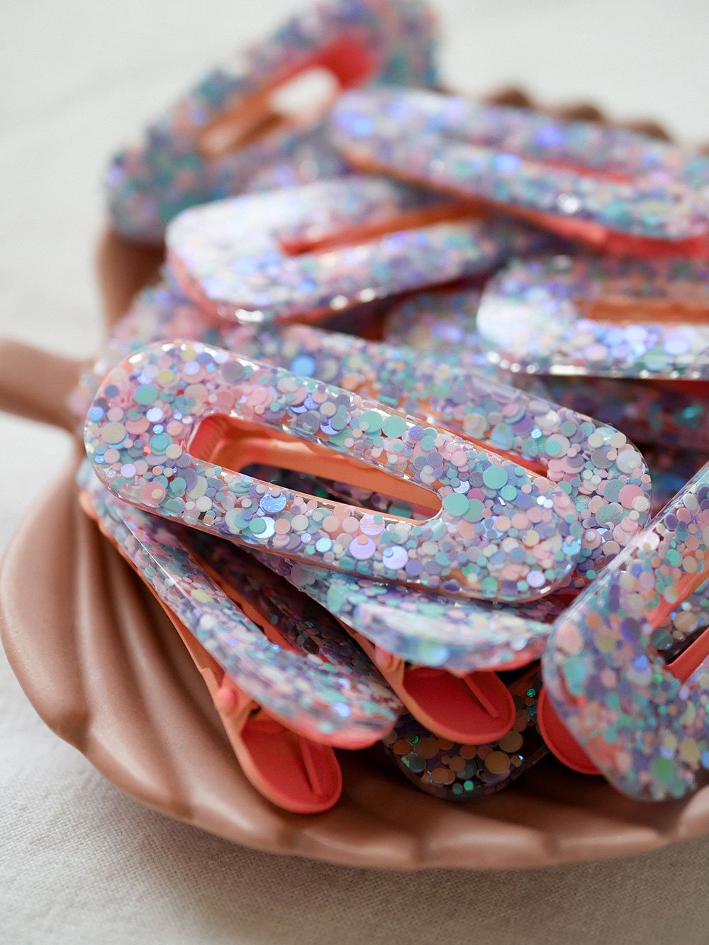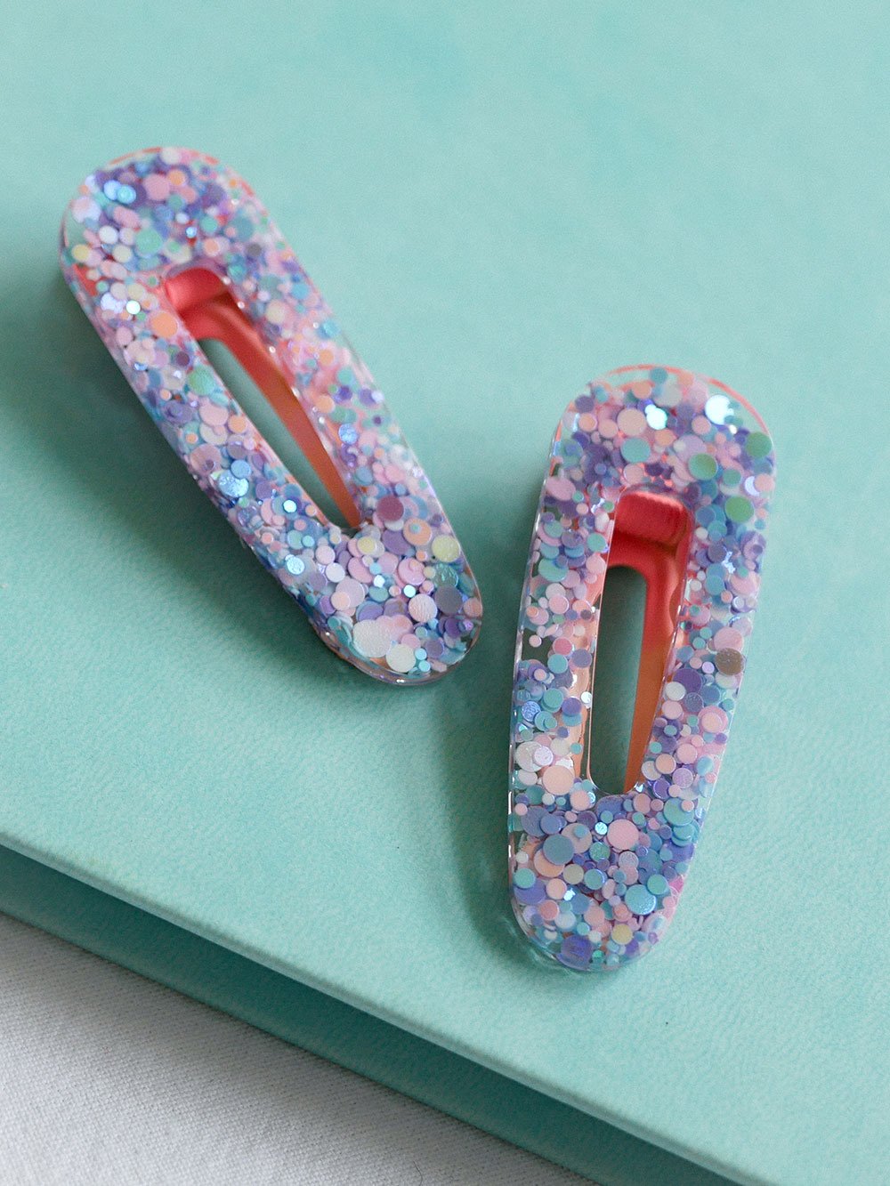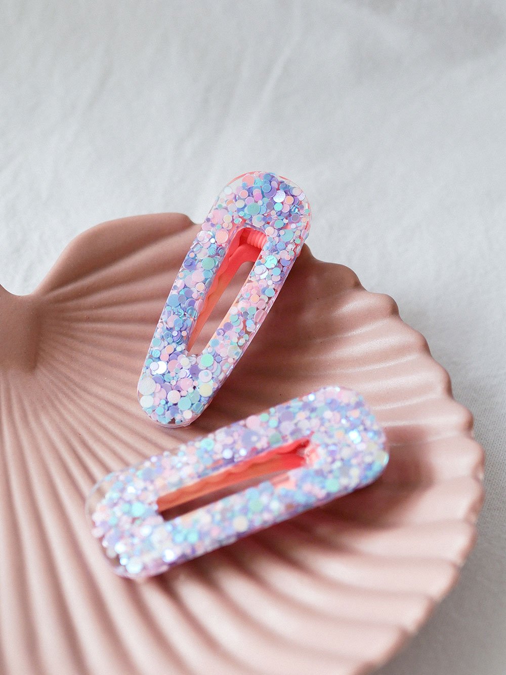 - Fixation de la pince : Pour parfaire l’ensemble, j’attache soigneusement une pince à cheveux, assortie dans des tons de rose pastel, créant ainsi une harmonie parfaite avec la résine pailletée. Chaque détail est pensé pour garantir un produit à la fois élégant et équilibré.